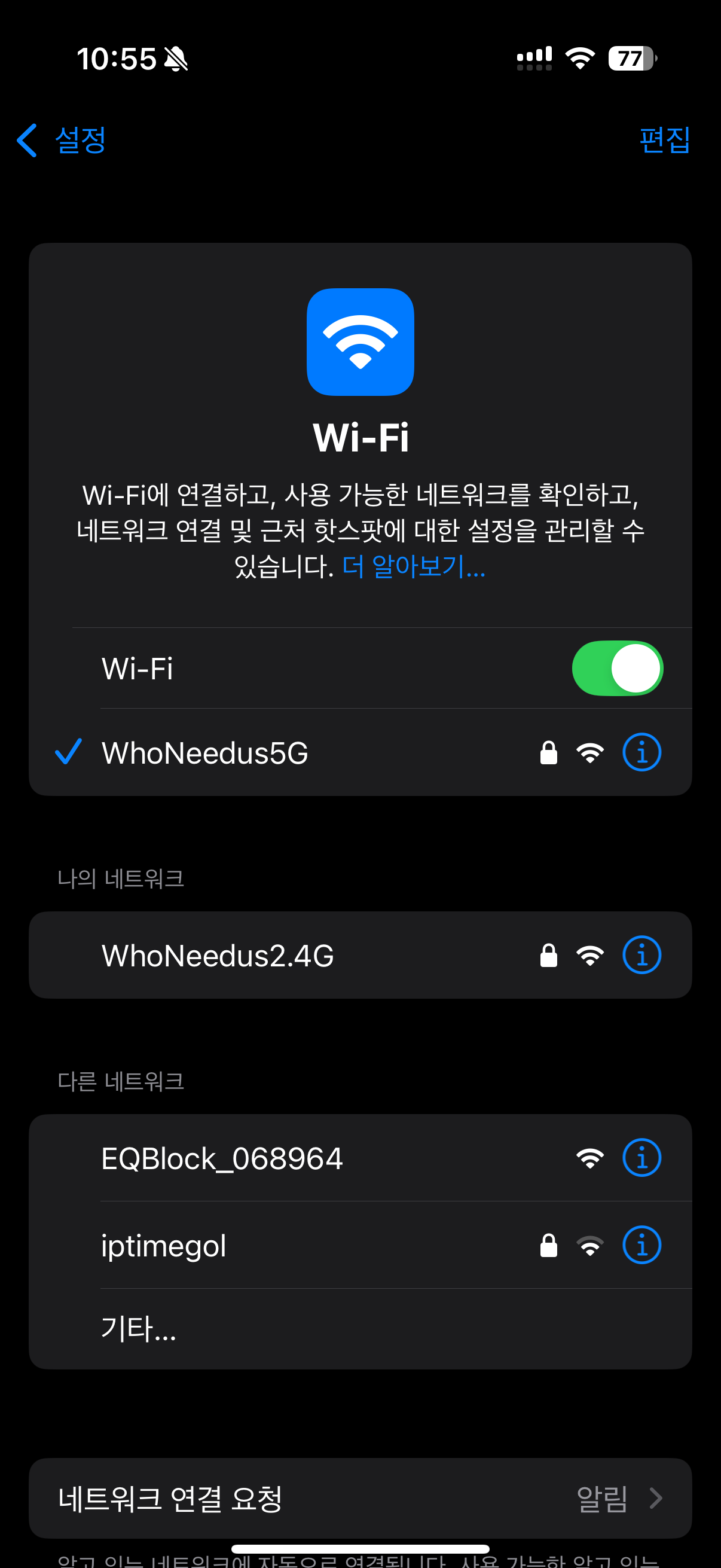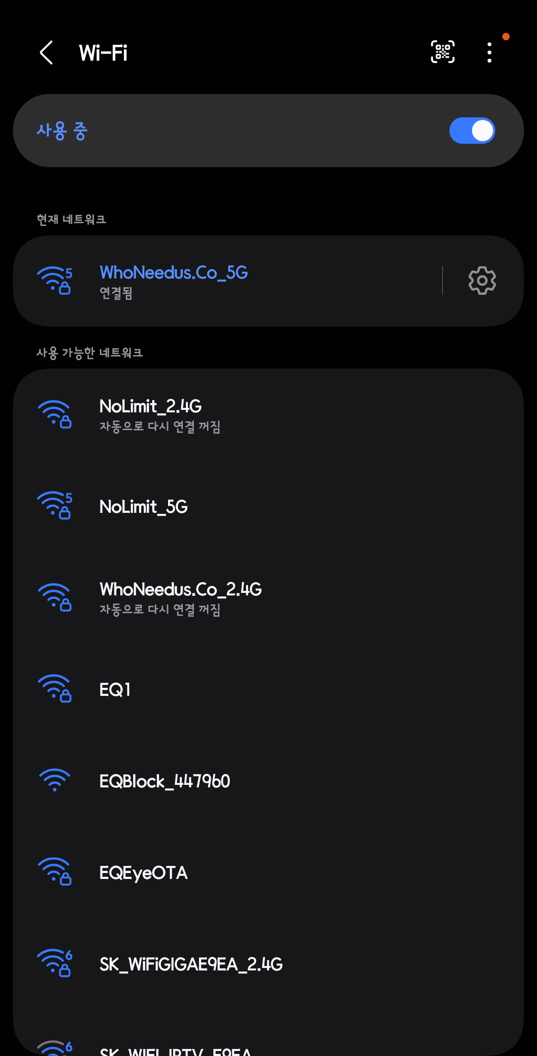 3. 스마트폰에서 WIFI를 켜고 공유기(AP)를 검색 합니다.