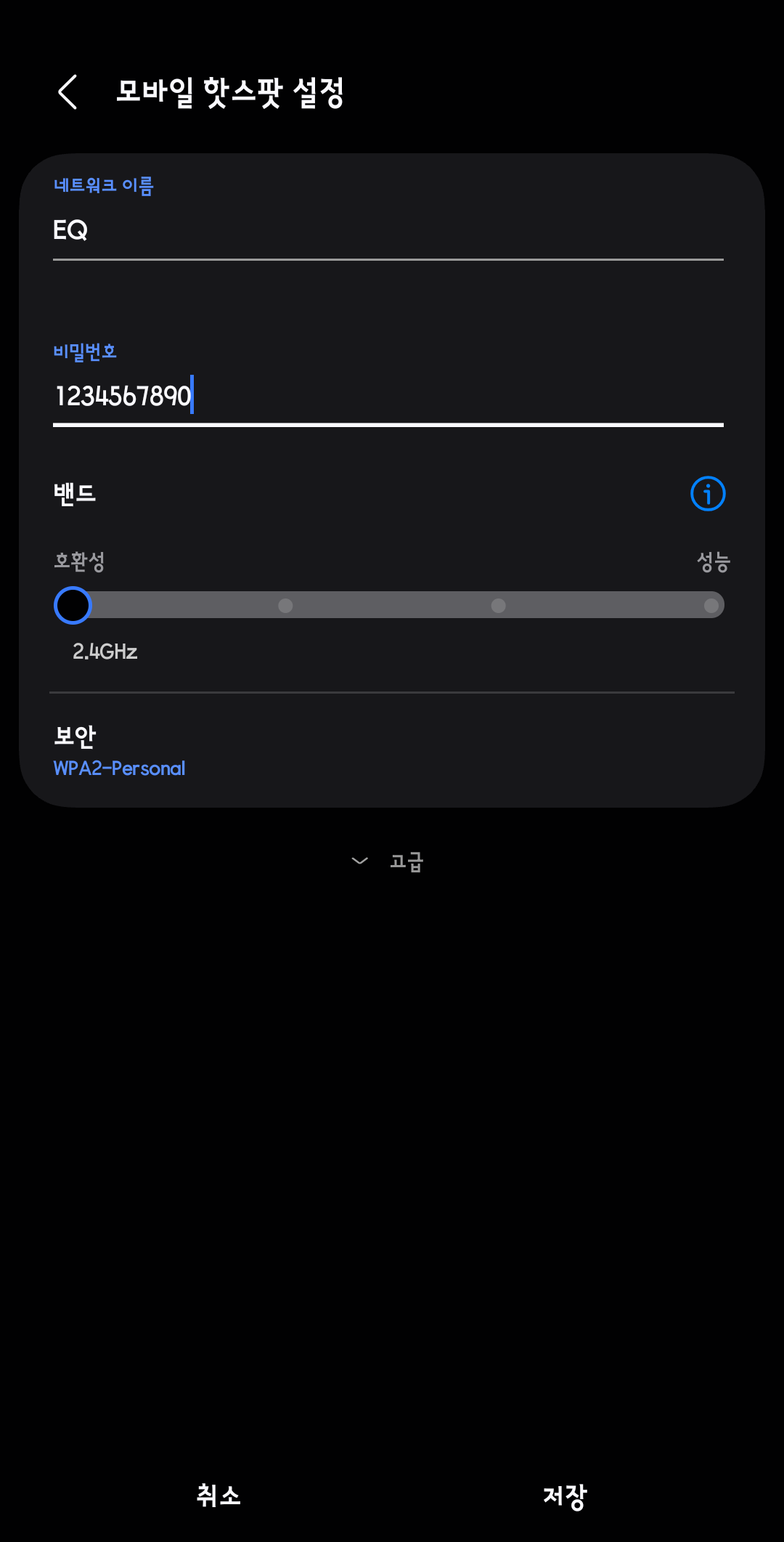 2. 화면과 같이 네트워크 이름 "EQ", 비밀번호 "1234567890", 밴드 "호환성 2.4Ghz"로 설정 합니다.