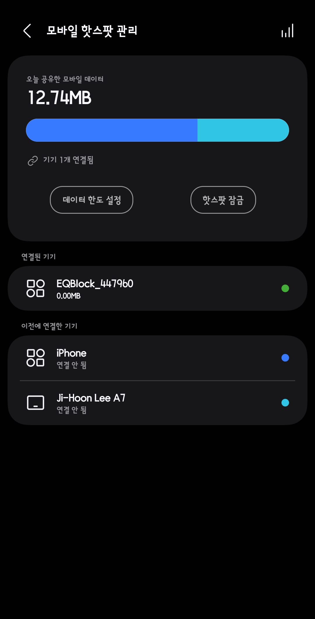 2. 모바일 핫스팟 관리 화면으로 이동하면 연결된 EQBlock을 확인할 수 있습니다.