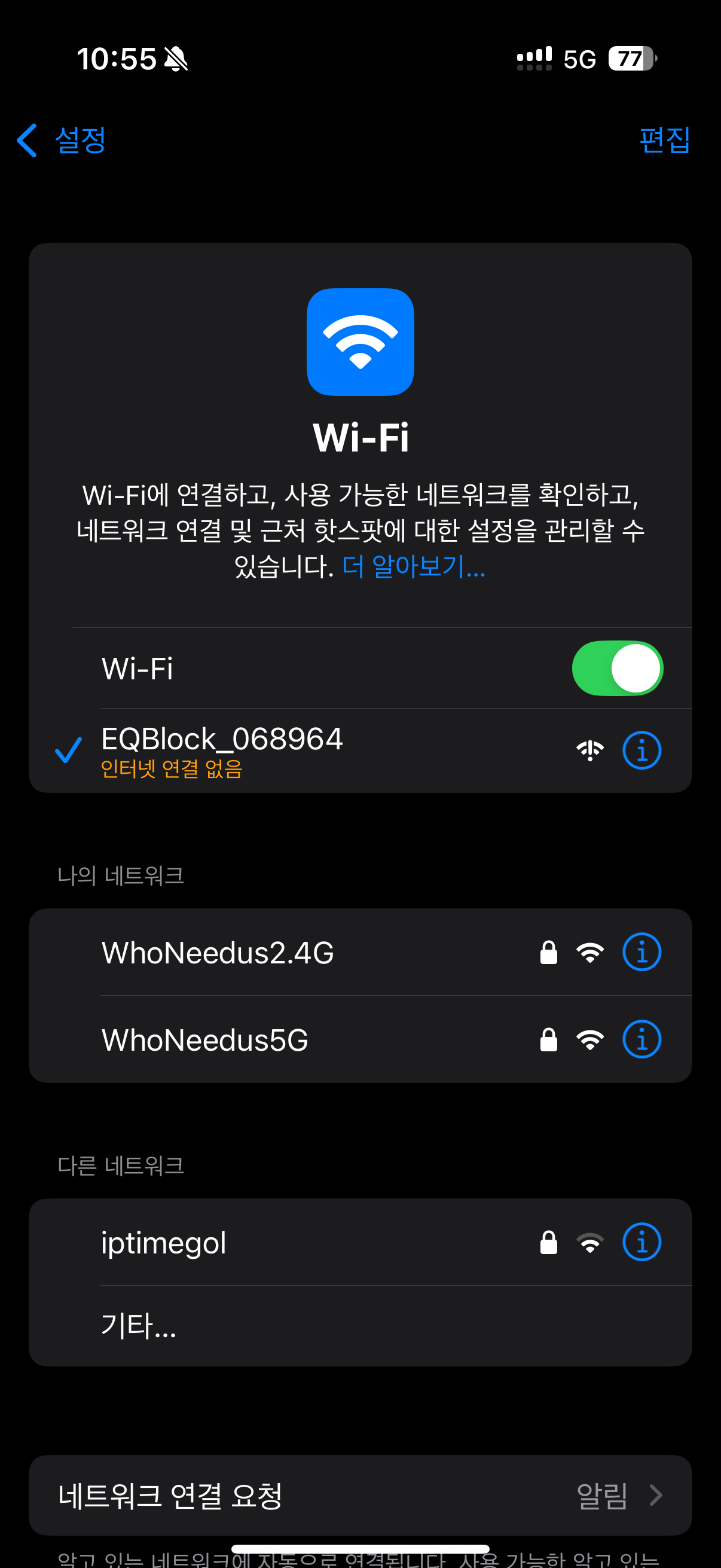 2. 화면과 같이 "인터넷 연결 없음"을 확인할 수 있습니다.