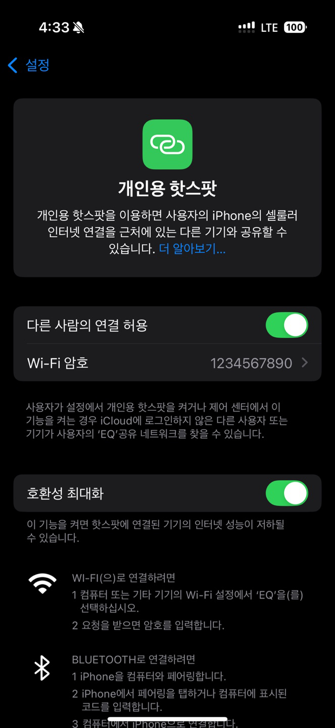 2. 화면과 같이 Wi-Fi 암호 "1234567890", 호환성 최대화를 체크 합니다.